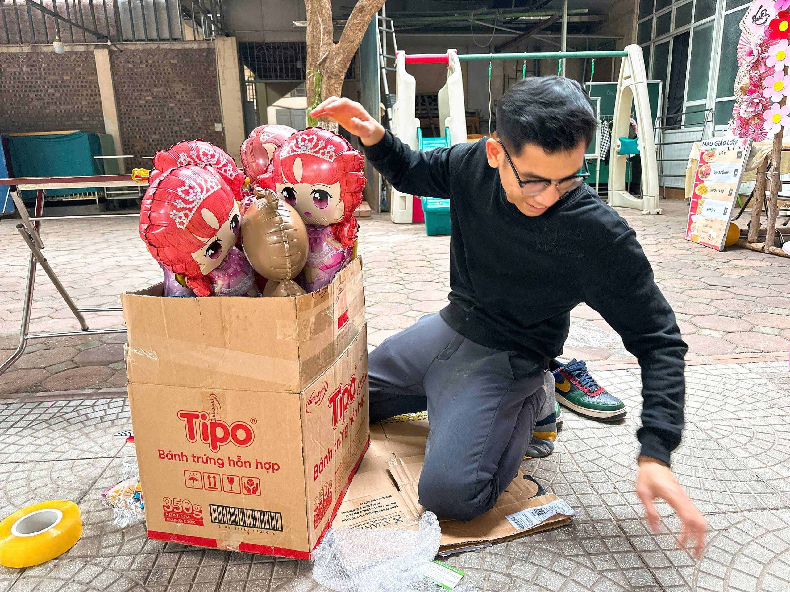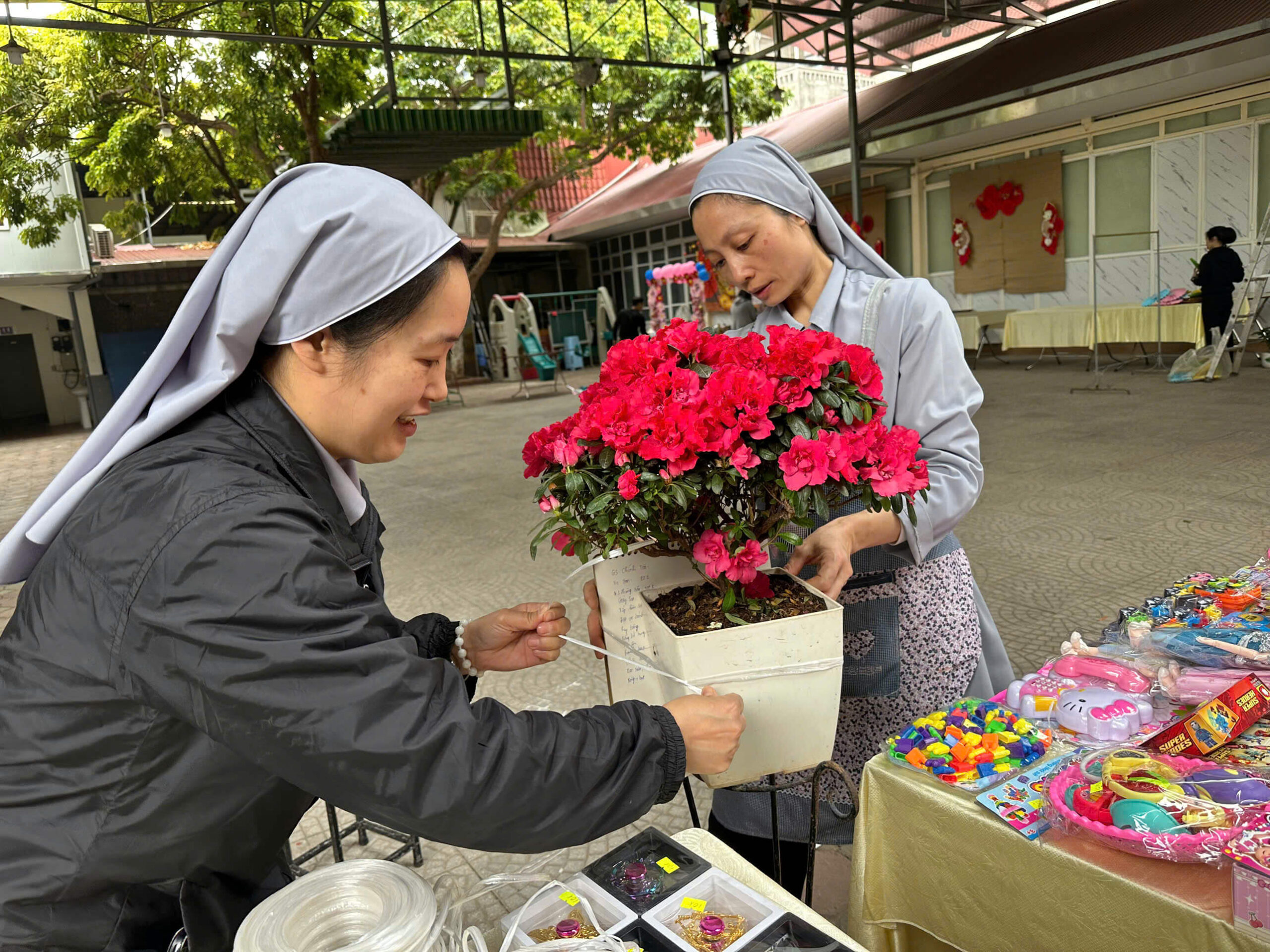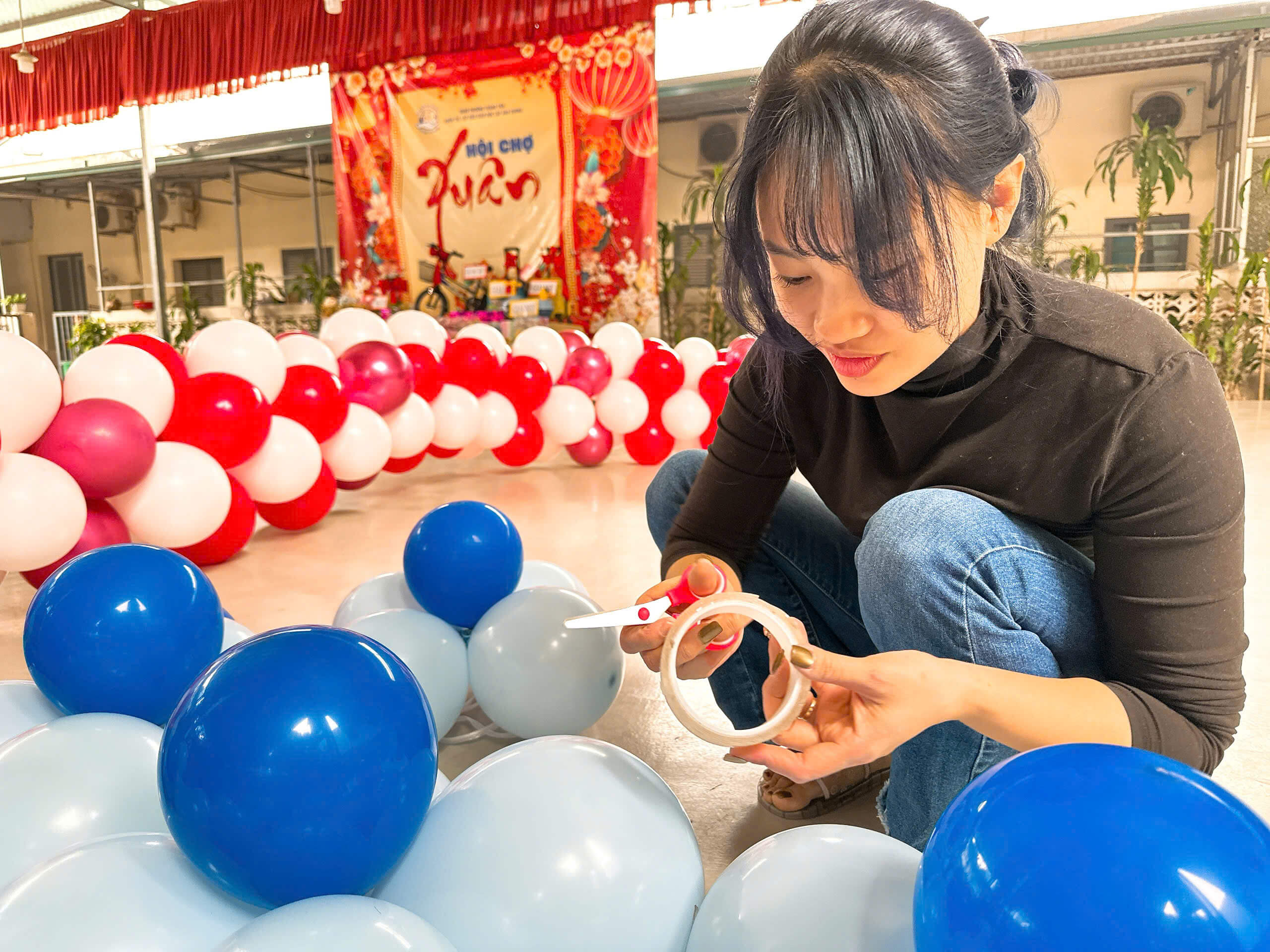 phụ huynh cùng cô giáo đang chuẩn bị cho gian hàng của mình