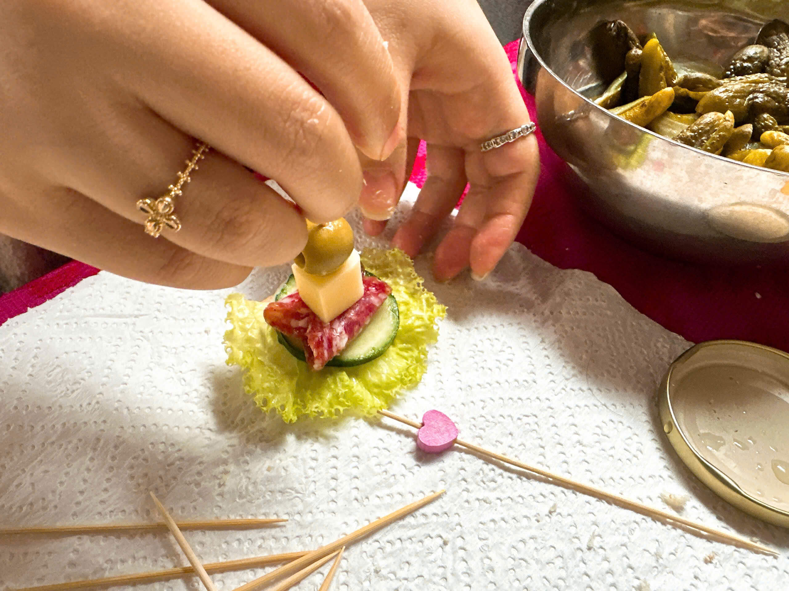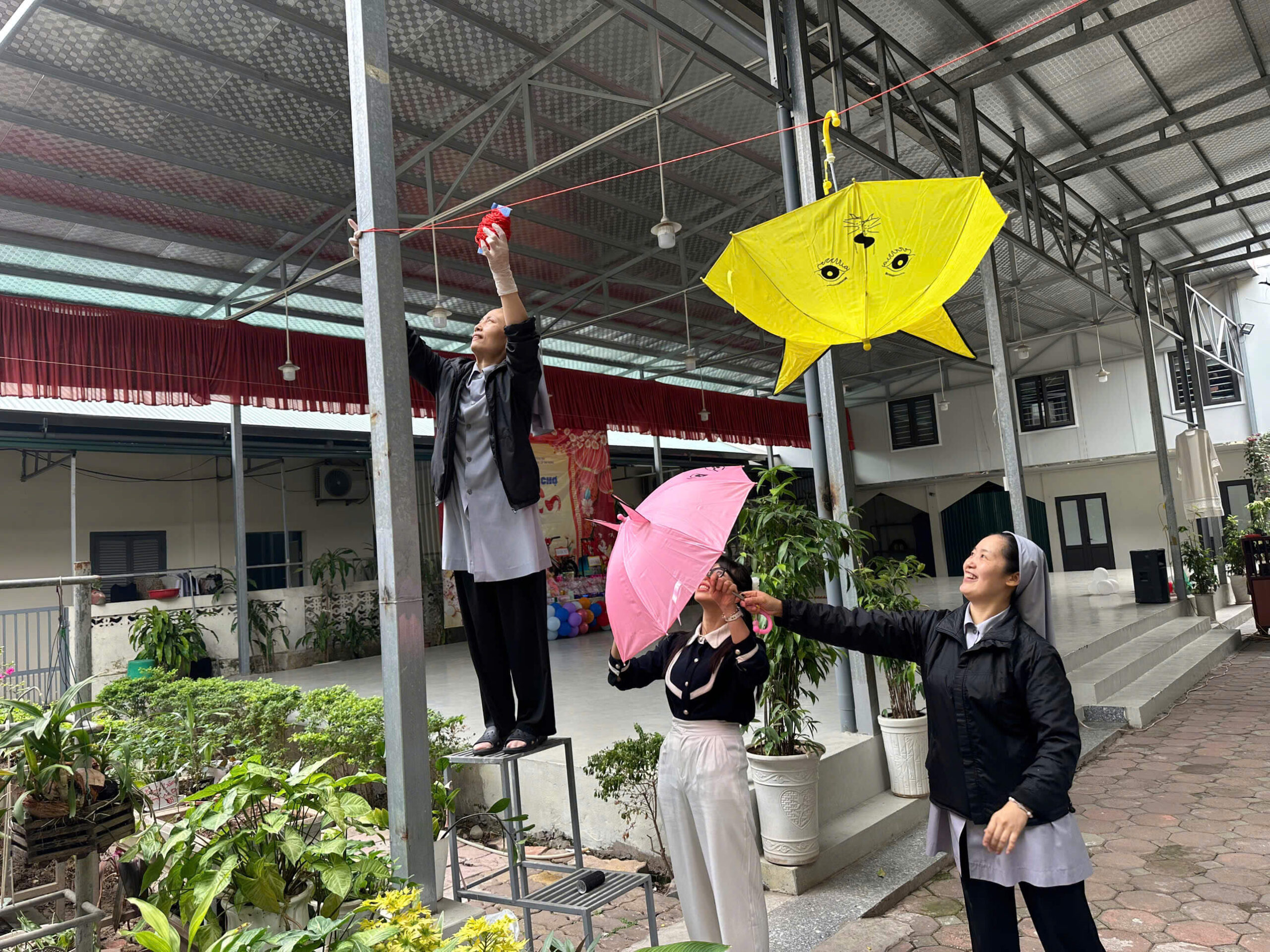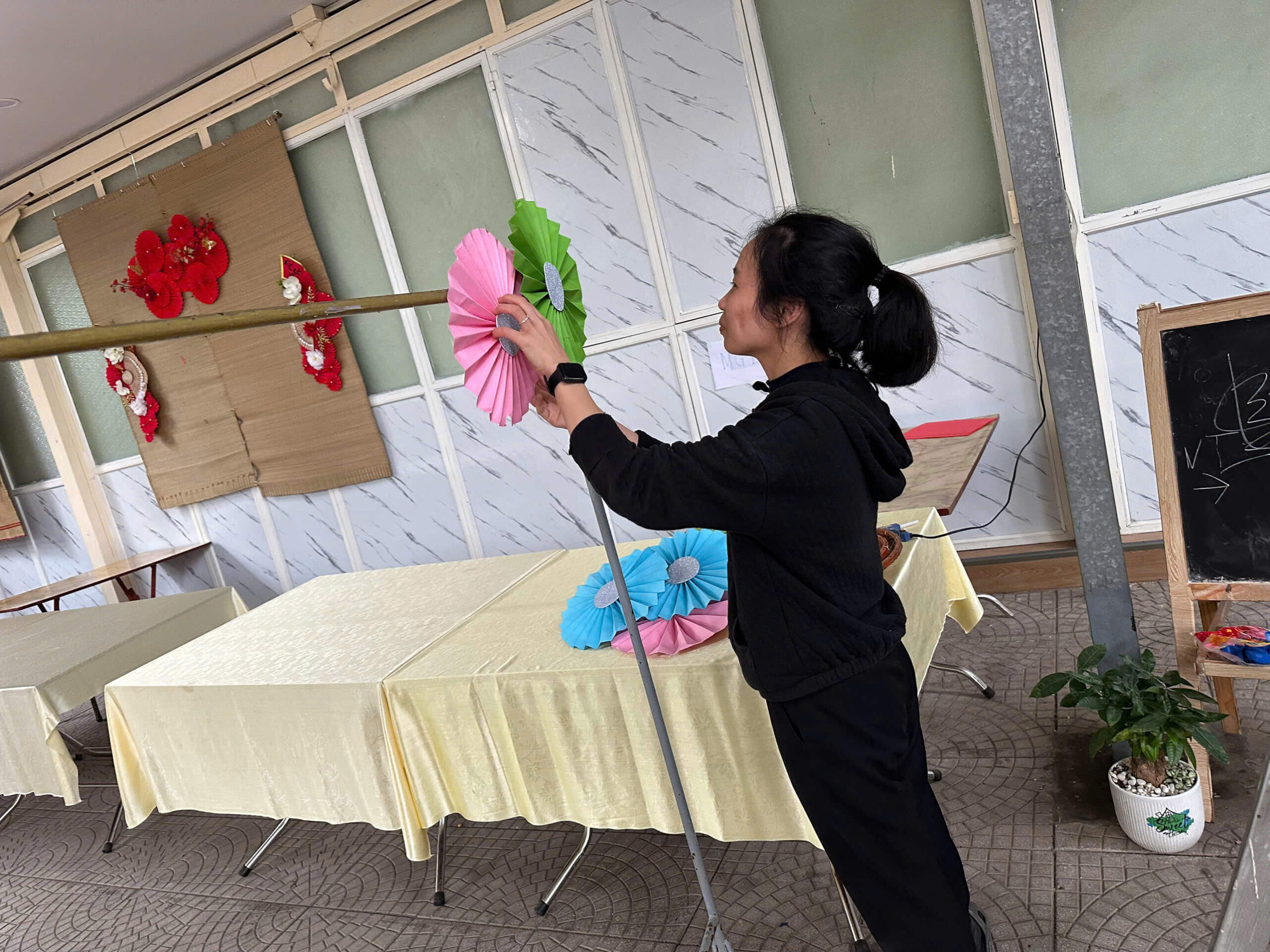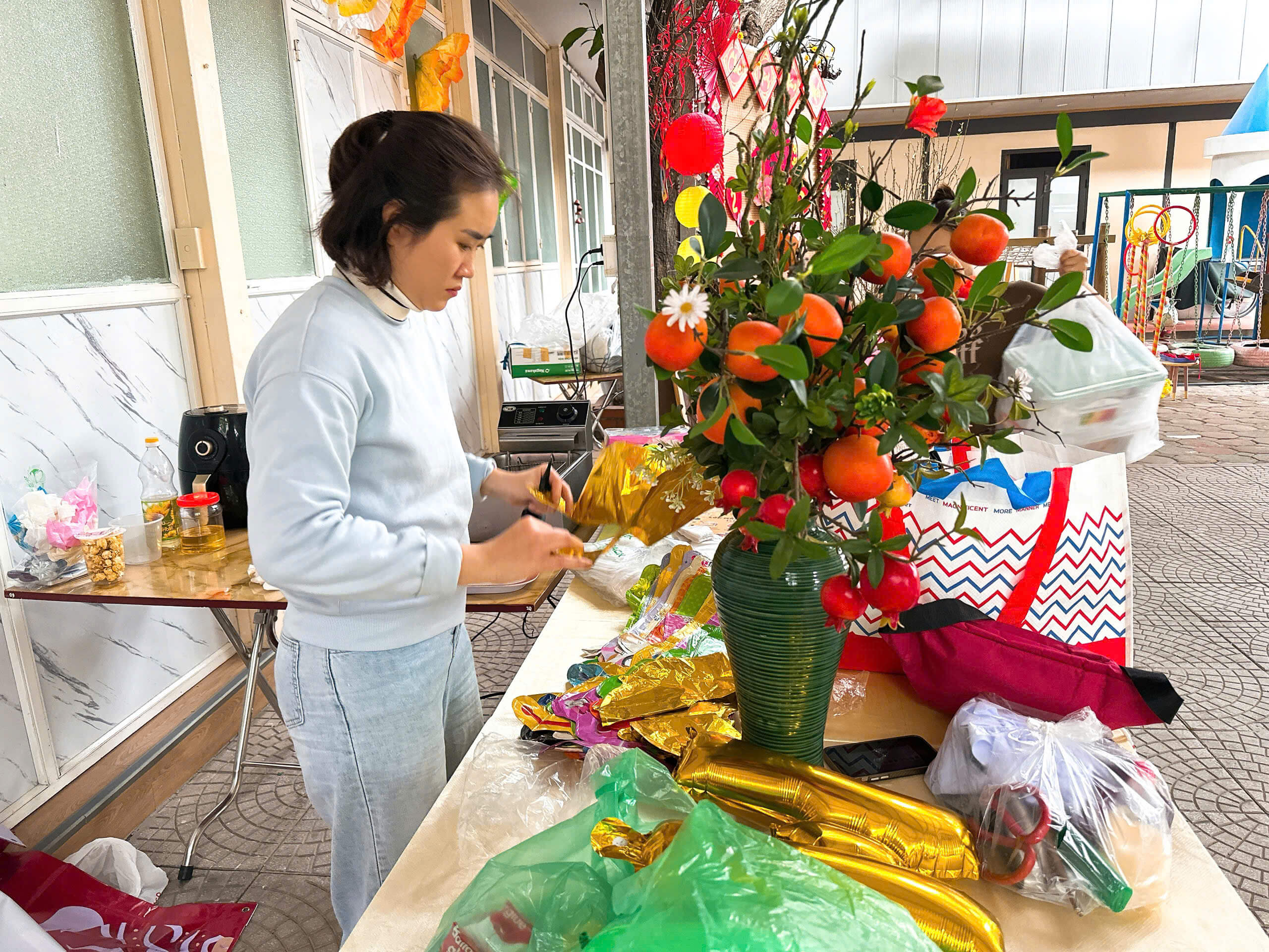 phụ huynh cùng cô giáo đang chuẩn bị cho gian hàng của mình