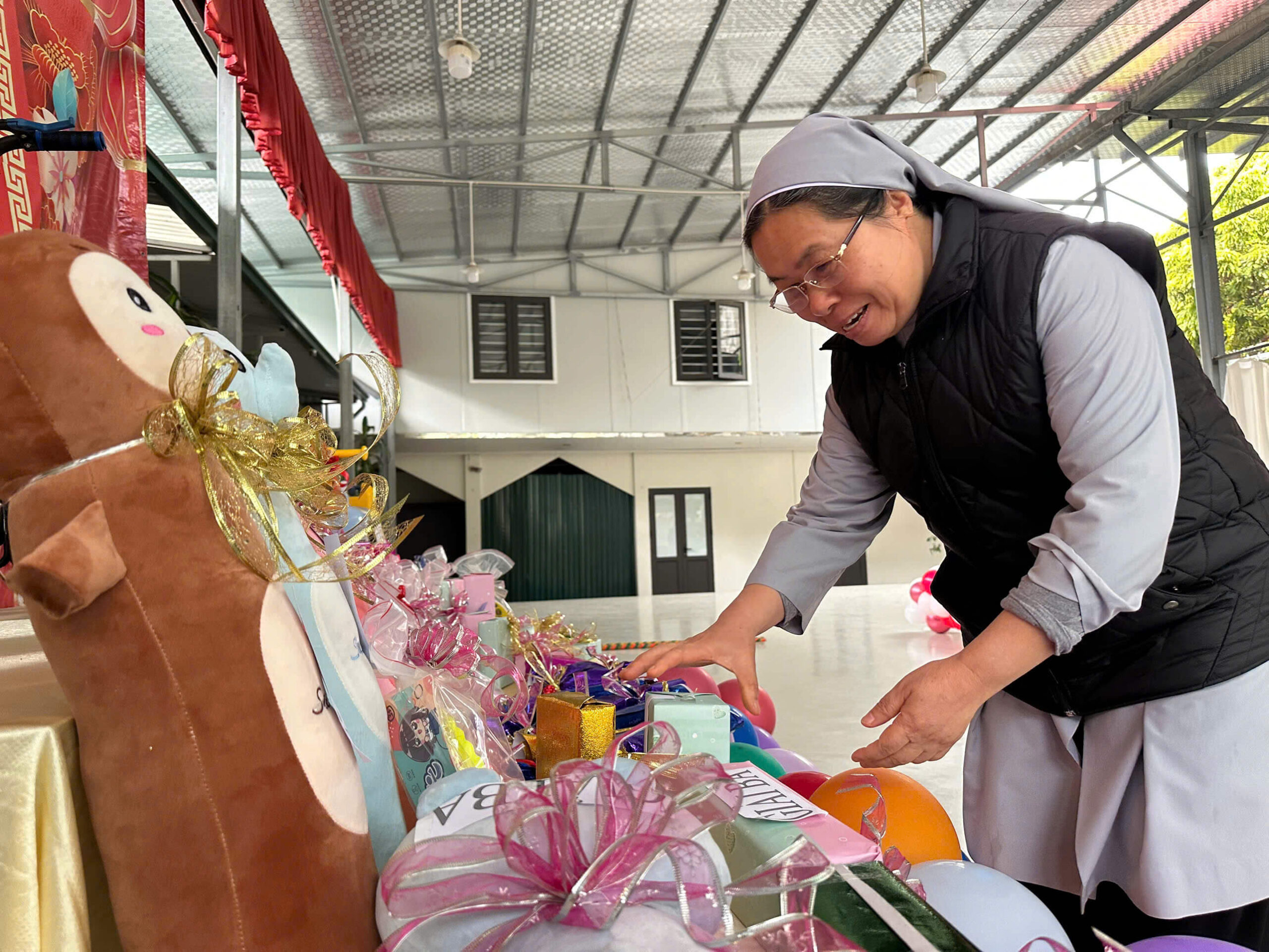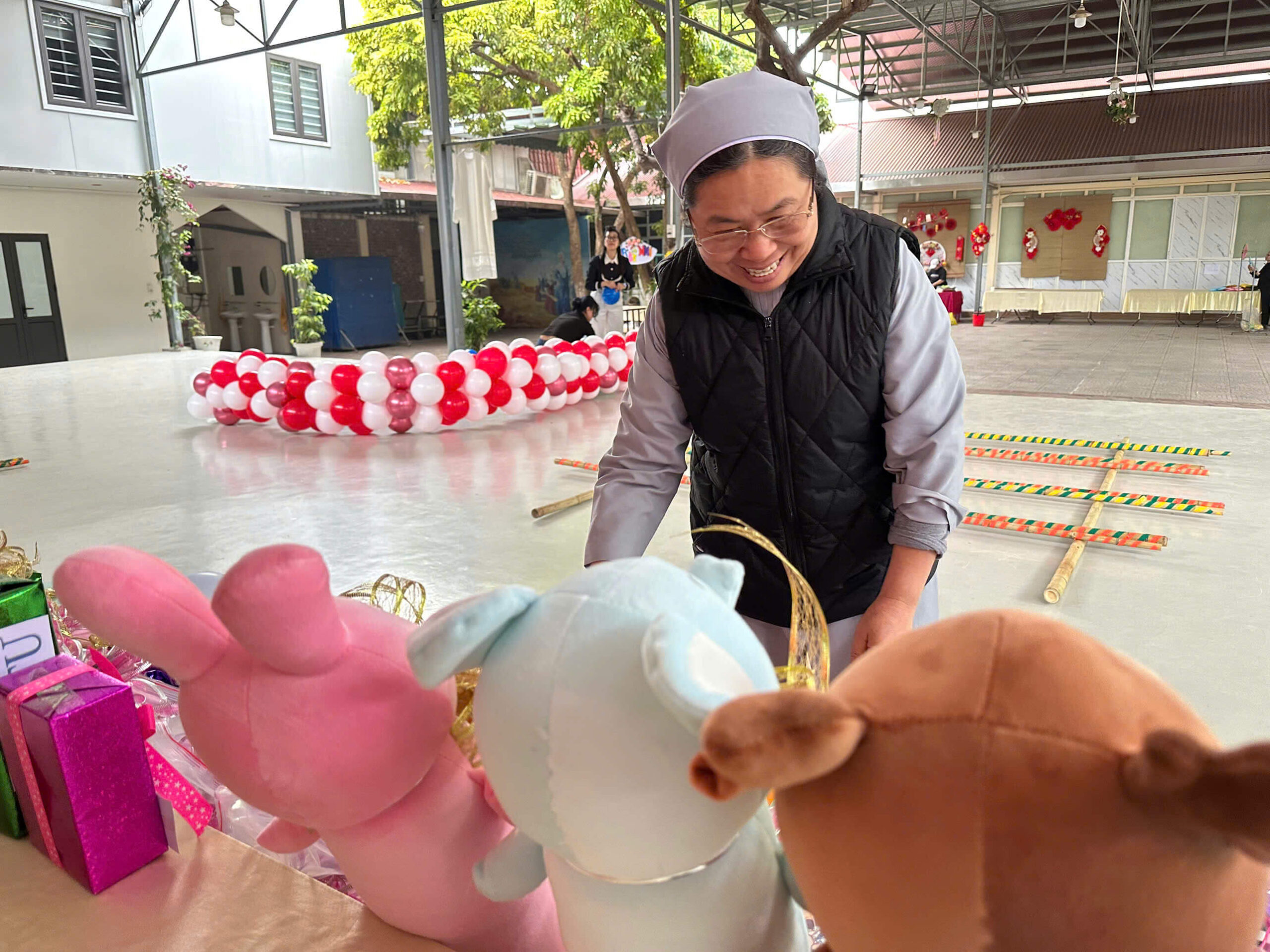 Quý Sr đang tự tay sắp xếp các giải thưởng cho trò chơi “Số gì đây “